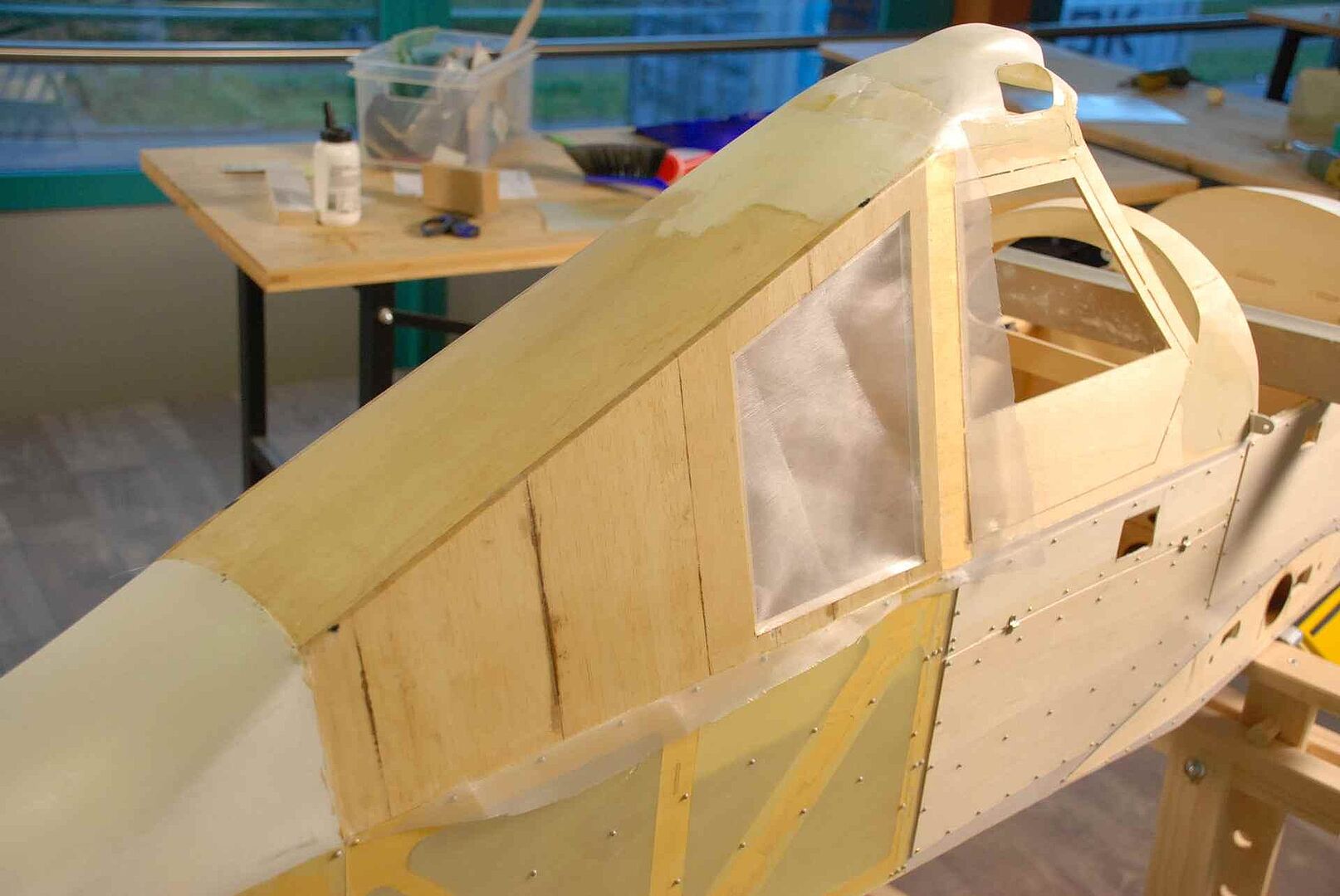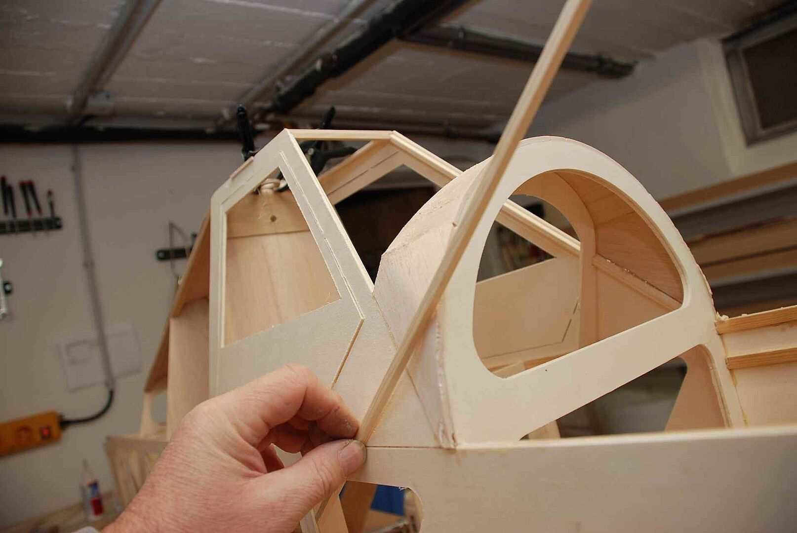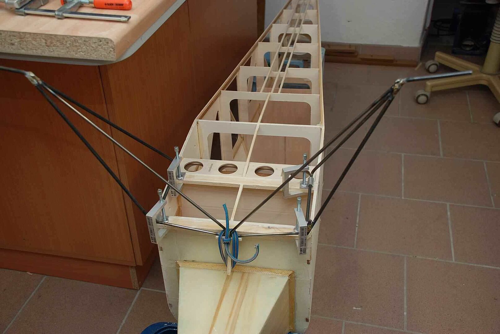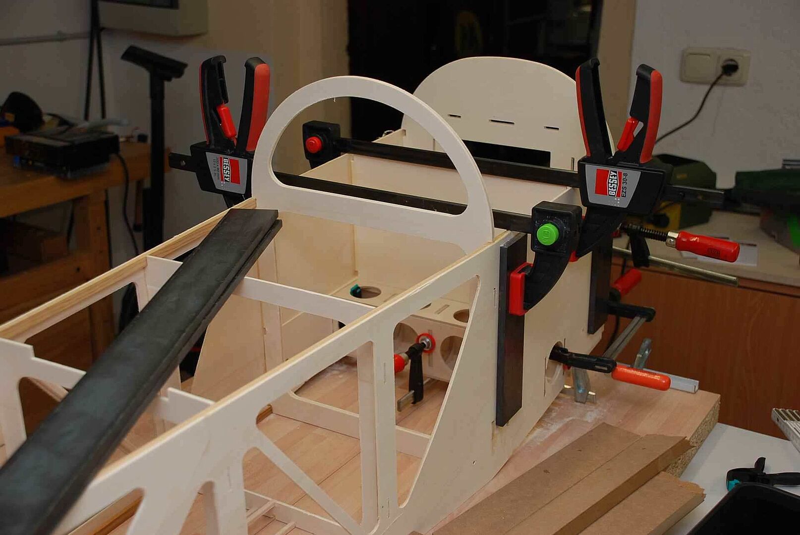 Alles begann mit einem großen Haufen Holz, meist Flugzeugsperrholz und Balsa, welches dann noch gesägt, geschliffen und verklebt wurde. Das war erstmal unspektakulär und es gibt nicht viel dazu zu sagen. Schau dir einfach die Bilder an um zu sehen wie schnell der Rumpf im Rohbau, in den nächsten Monaten entstanden ist. Später gibt es dann mehr Probleme und Herausforderungen, auf die ich dann näher eingehen werde.