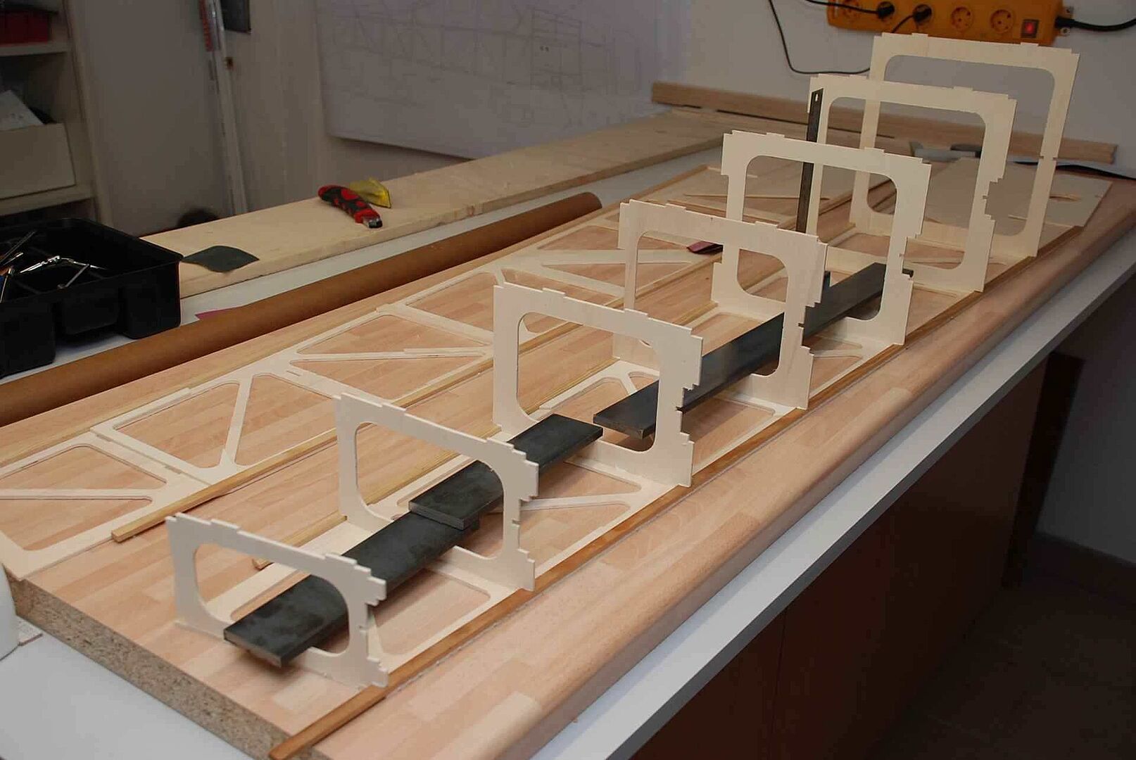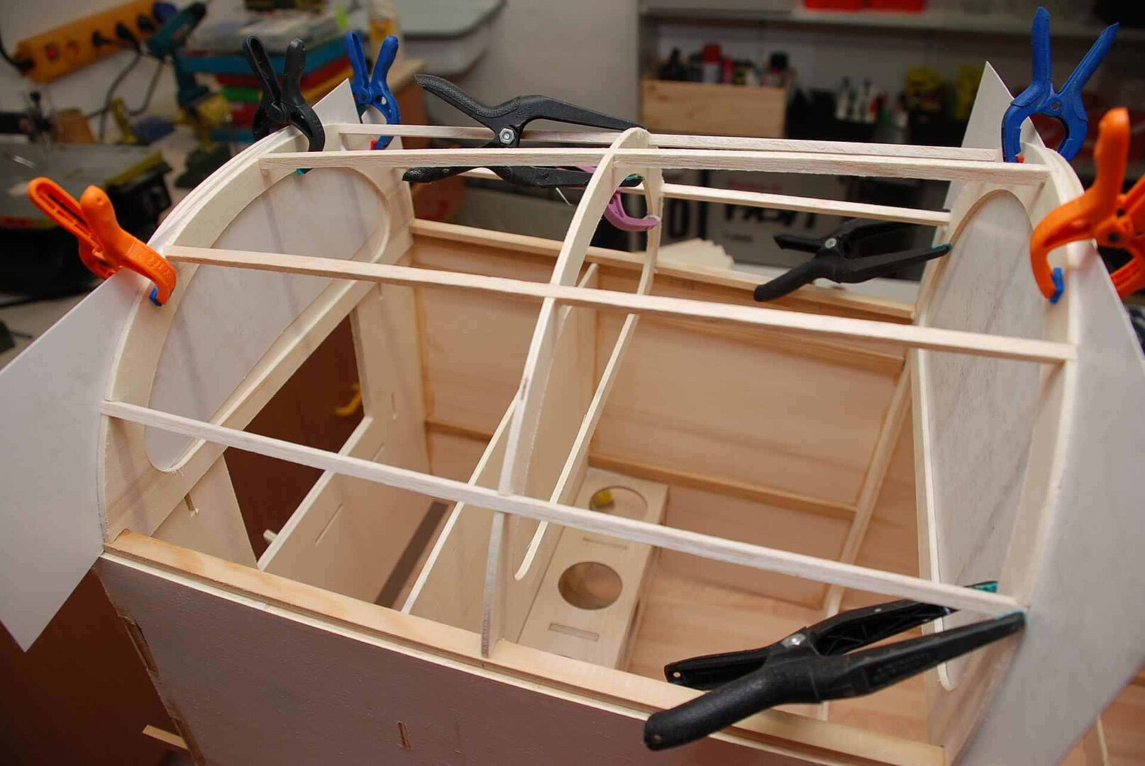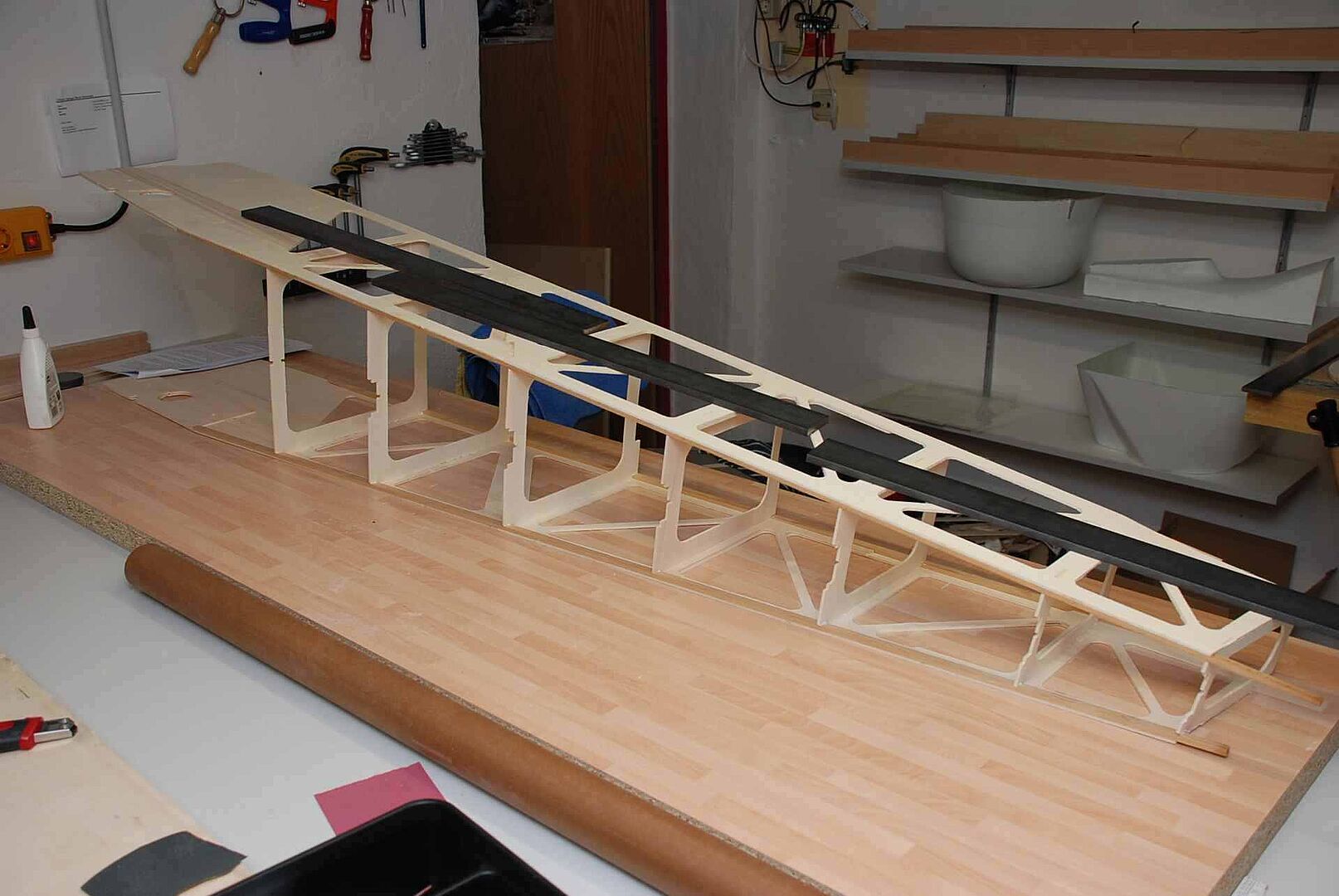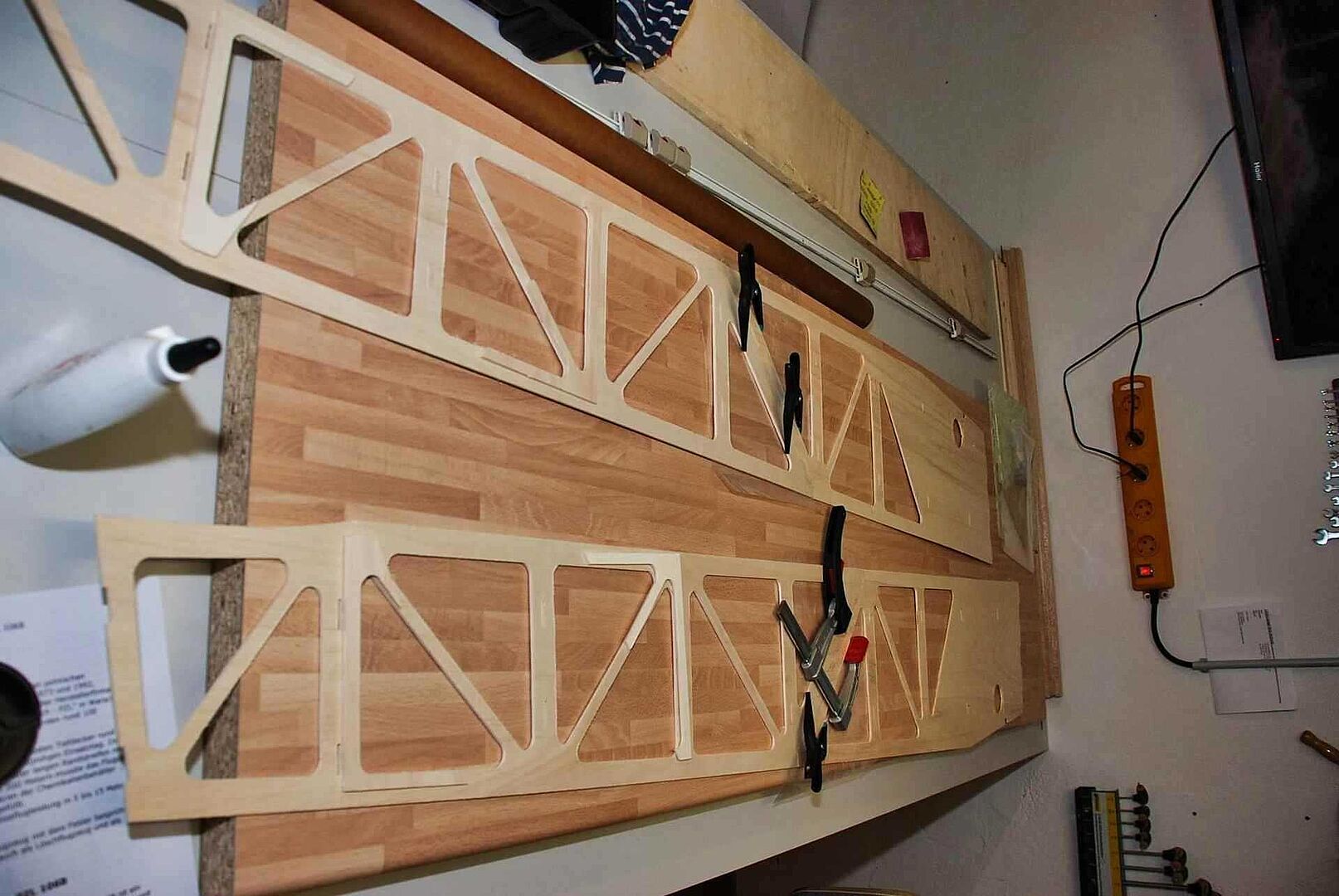 Alles begann mit einem großen Haufen Holz, meist Flugzeugsperrholz und Balsa, welches dann noch gesägt, geschliffen und verklebt wurde. Das war erstmal unspektakulär und es gibt nicht viel dazu zu sagen. Schau dir einfach die Bilder an um zu sehen wie schnell der Rumpf im Rohbau, in den nächsten Monaten entstanden ist. Später gibt es dann mehr Probleme und Herausforderungen, auf die ich dann näher eingehen werde.