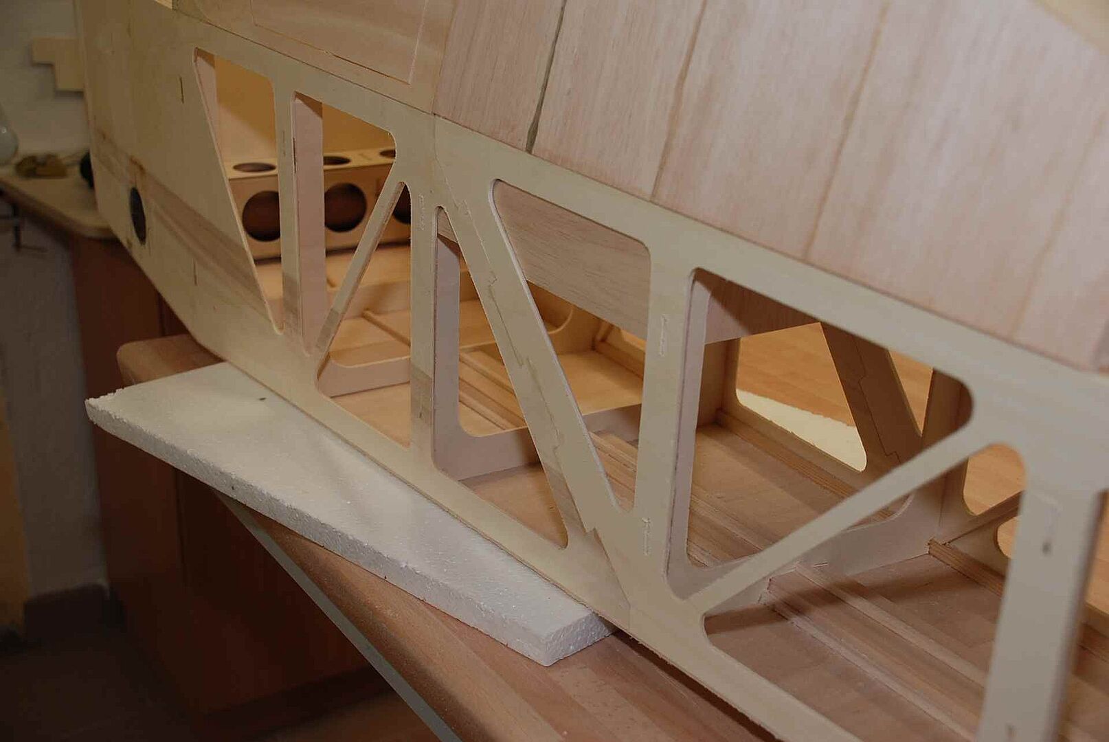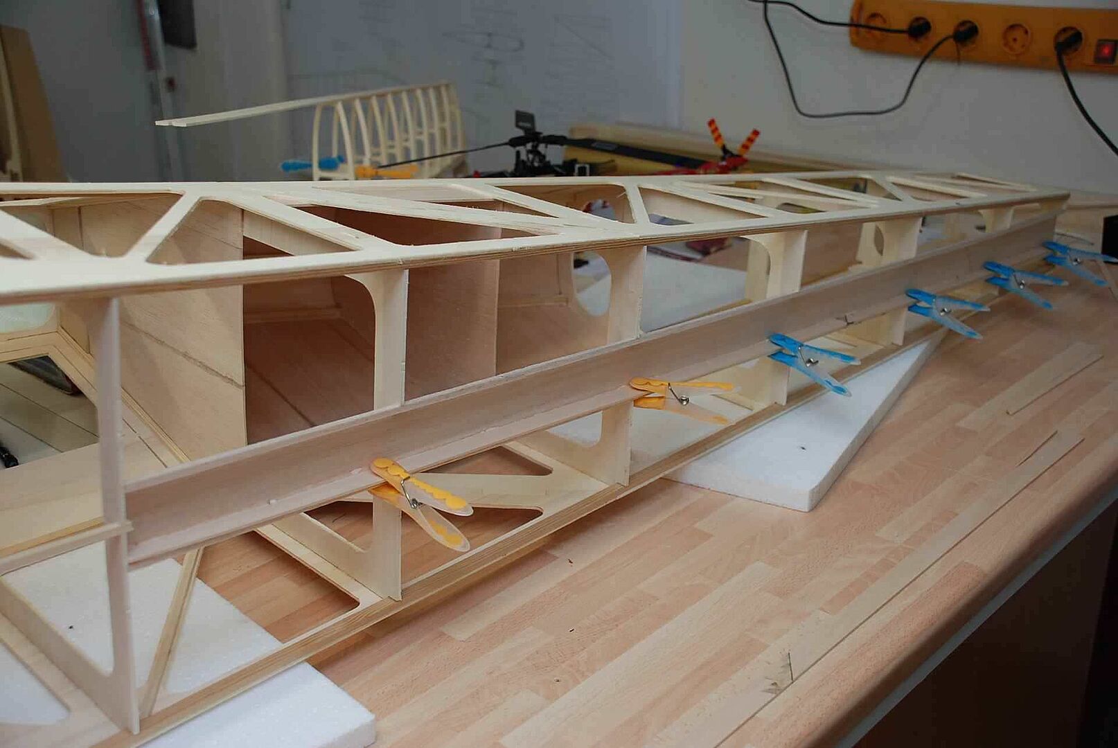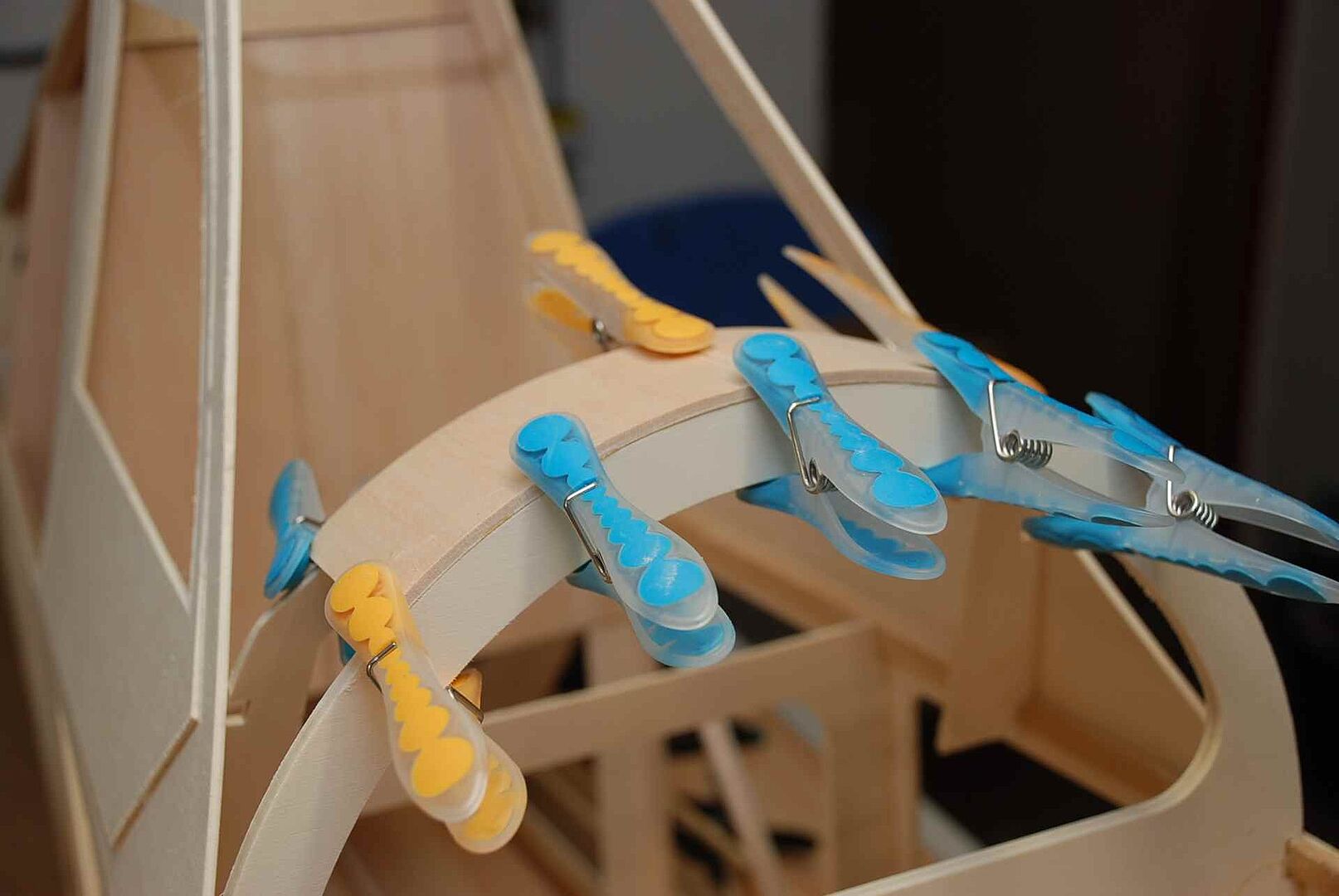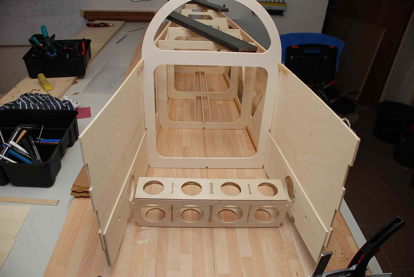 Alles begann mit einem großen Haufen Holz, meist Flugzeugsperrholz und Balsa, welches dann noch gesägt, geschliffen und verklebt wurde. Das war erstmal unspektakulär und es gibt nicht viel dazu zu sagen. Schau dir einfach die Bilder an um zu sehen wie schnell der Rumpf im Rohbau, in den nächsten Monaten entstanden ist. Später gibt es dann mehr Probleme und Herausforderungen, auf die ich dann näher eingehen werde.