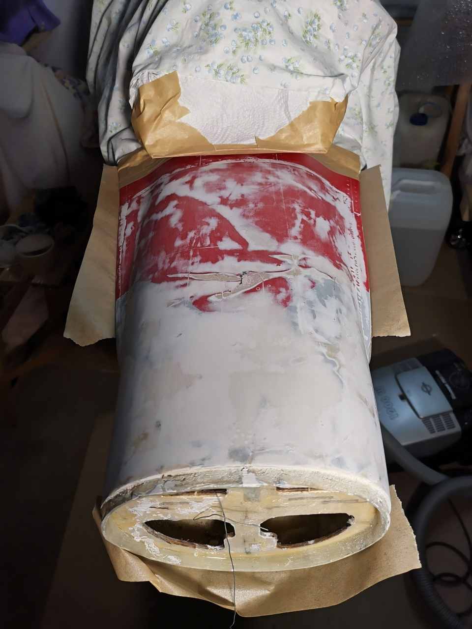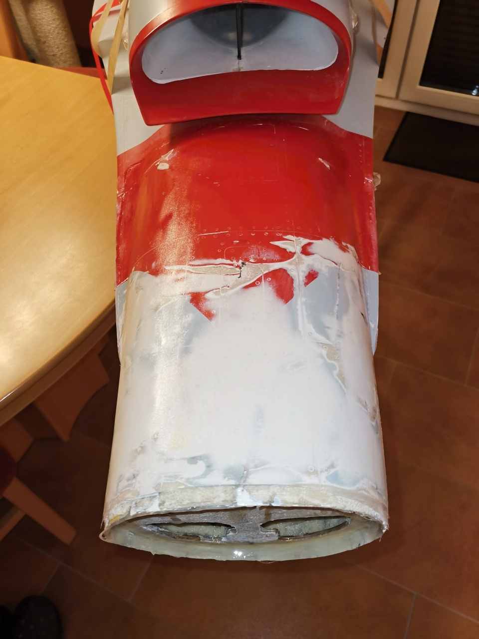 Ich habe dann das zusammen geheftete Vorderteil und die Kegelspitze von innen angeschliffen und mit einer Lage 120 g Glasfasermatte verstärkt. Zum Aushärten habe ich den Flieger dann ins Wohnzimmer verbracht, da es in meiner ungeheizten Werkstatt zu kühl war. Danach habe ich dann das Vorderteil mehrmals gespachtelt und verschliffen