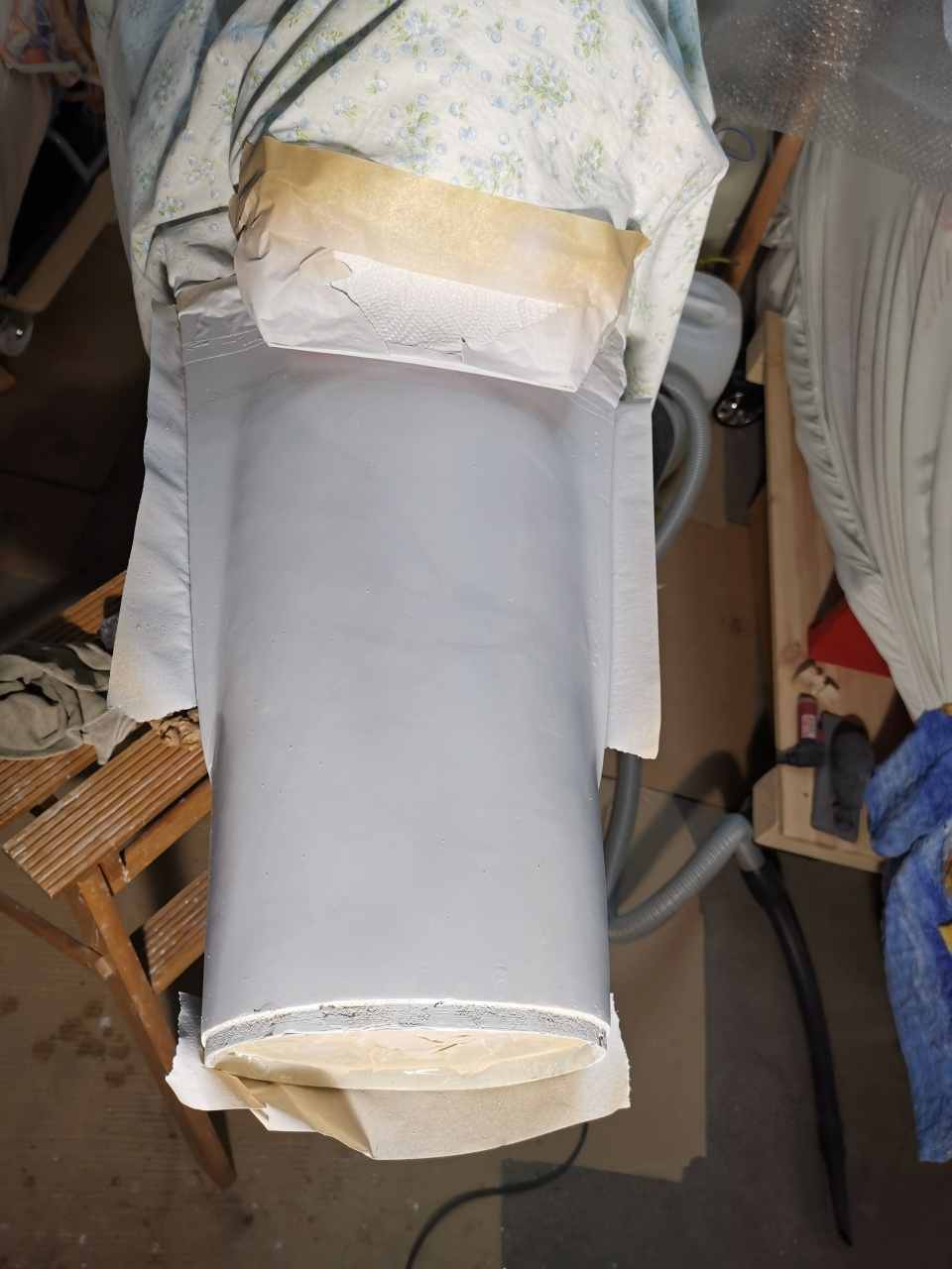 und mit einer dünnen 40 g Glasfasermatte überzogen. Aushärtung wieder im Wohnzimmer über Nacht.