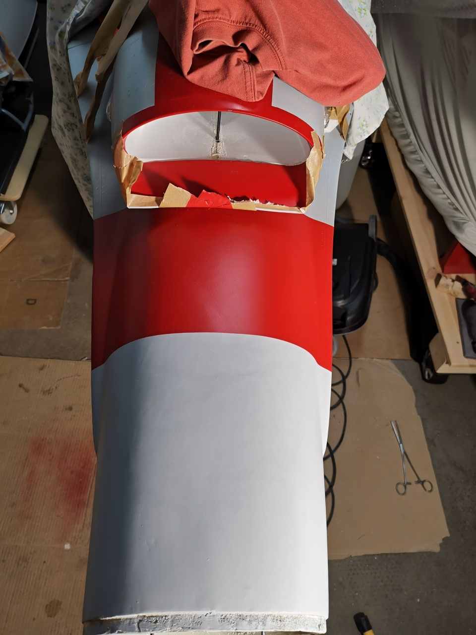Den Kabinenhaubenbügel, der beim Überschlag gebrochen war, habe ich mit Glasfaserrowings von innen verstärkt (sollte nun einen weiteren Überschlag Stand halten), dann gespachtelt und lackiert.
