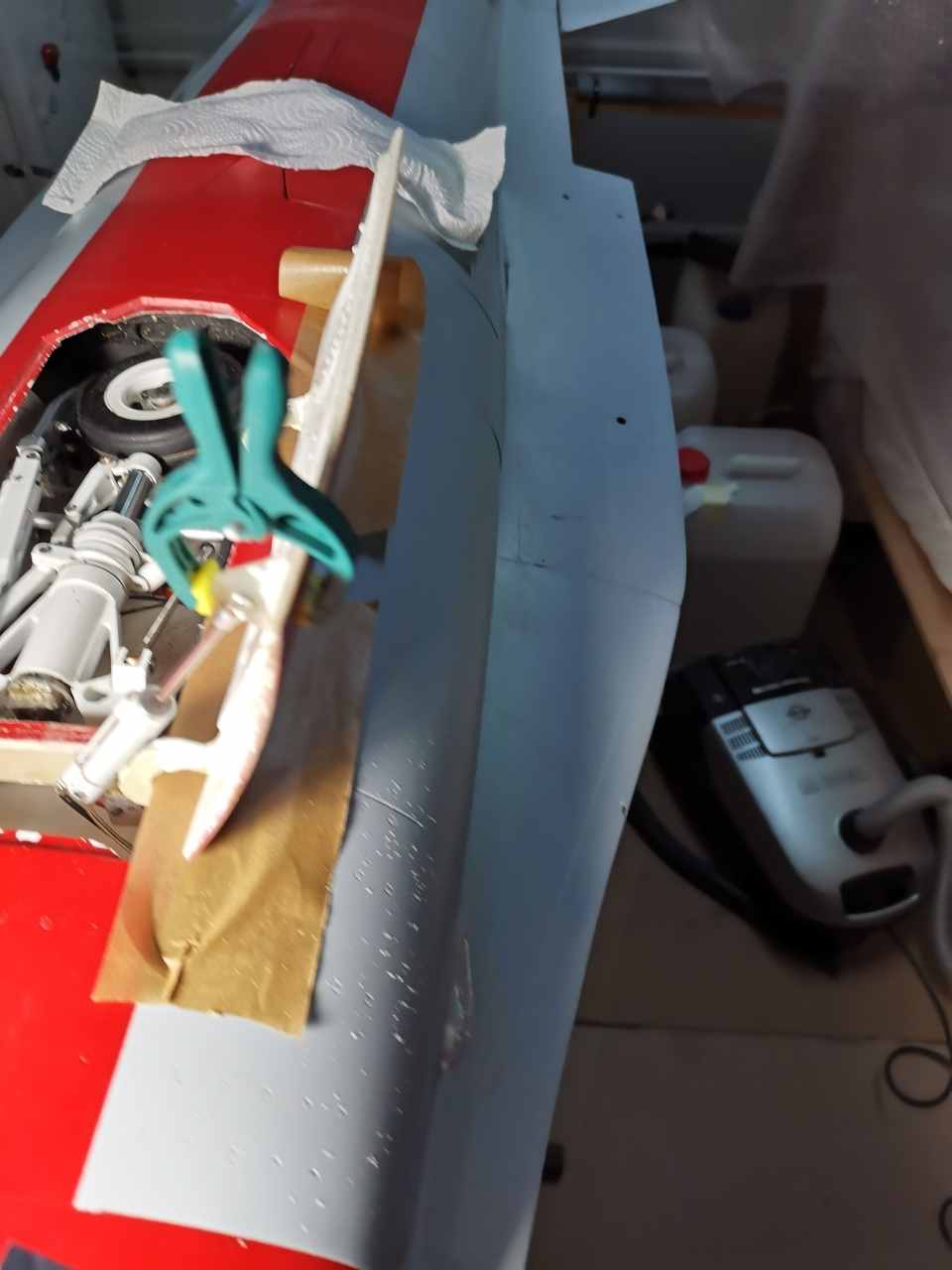Das Bugfahrwerk habe ich mit einer neuen Knickstrebe und mit Richten der Teile repariert bekommen. Die Fahrwerksklappe habe ich an den gebrochenen Scharnieren wieder zusammen geklebt und seitlich verstärkt (Ausbau und erneuern war nur sehr schwer möglich, da unzugänglich angeklebt).