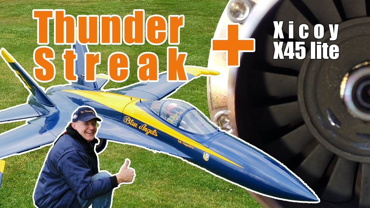 Der Modellflugjet Thunder Streak F18 von Phoenix Modellbau ist ein ARF Flugmodell mit hohem Fertigungsgrad. Das Modellflugzeug besteht aus einer leichten und hochfesten Holzkonstruktion aus lasergeschnittenen Einzelteilen und ist mit Oracover Folie bespannt. Ursprünglich vorgesehen ist er für einen Impeller von 90-115 mm. Ich habe ihn allerdings mit einer kleinen Turbine von Xicoy versehen. Das ganze Setup funktioniert sehr gut. Auch das Flugverhalten ist absolut unkritisch. Jedoch ist das Modell aufgrund des hohen Geschwindigkeitsbereichs eher für erfahrene Piloten geeignet. Aber es macht sehr viel Spaß, damit zu fliegen und es ist aufgrund der Größe auch für kleinere Modellflugplätze geeignet. Schaut euch gerne das Video von meinem Flug an.