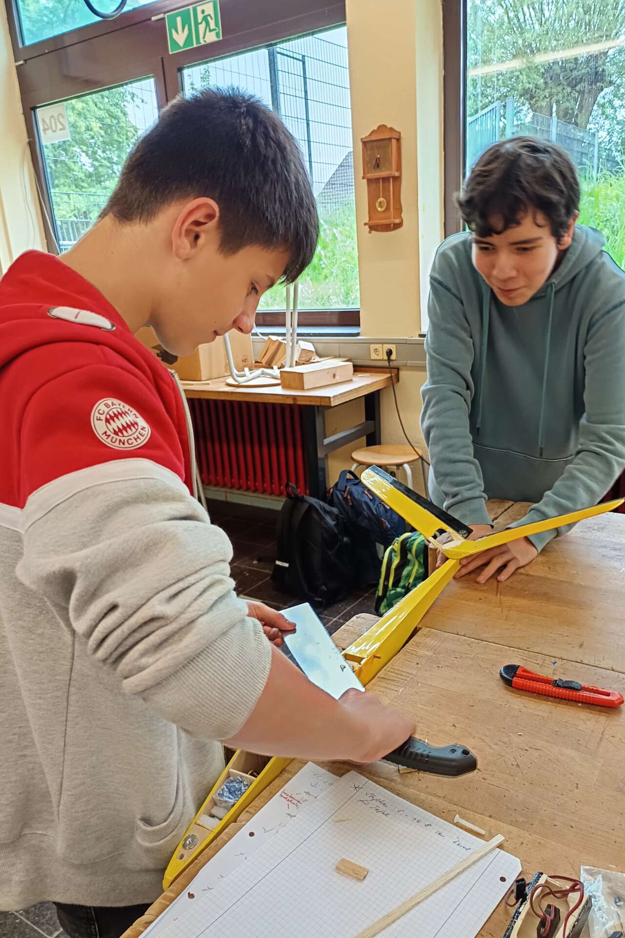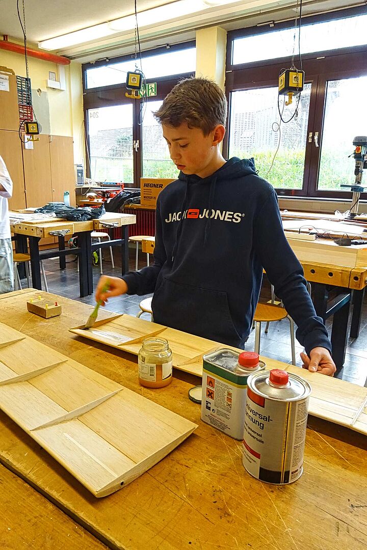 Werkstattbetrieb im April 24: In der Werkstatt der Realschule lernen die Jugendlichen gebrauchte Modellflugzeuge zu reparieren und zu restaurieren, um sie wieder erfolgreich einsatzfähig zu machen. Dabei werden alle handwerklichen Fähigkeiten im Umgang mit den verschiedenen Materialien und Werkzeugen erlernt. Später wird jedes Modellflugzeug wieder auf unserem Modellflugplatz eingesetzt.